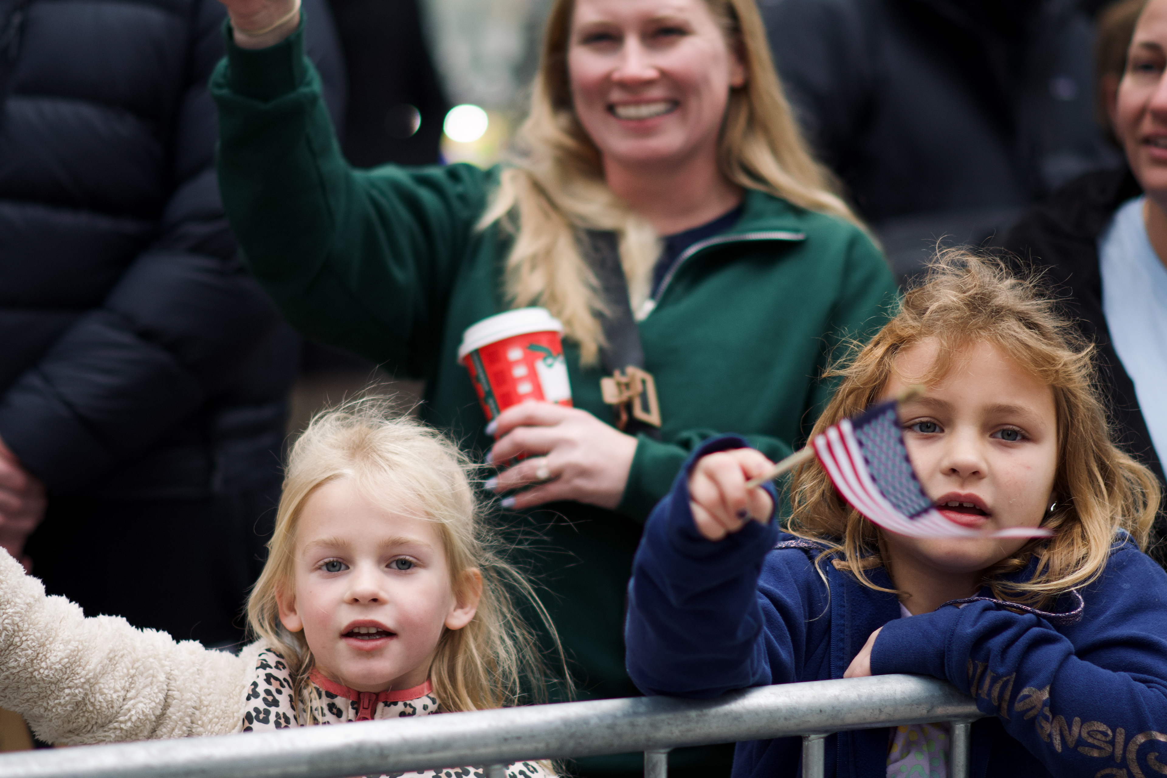 Children wave American flags as they watch the Veterans Day Parade in New York on Tuesday, Nov. 11, 2025.