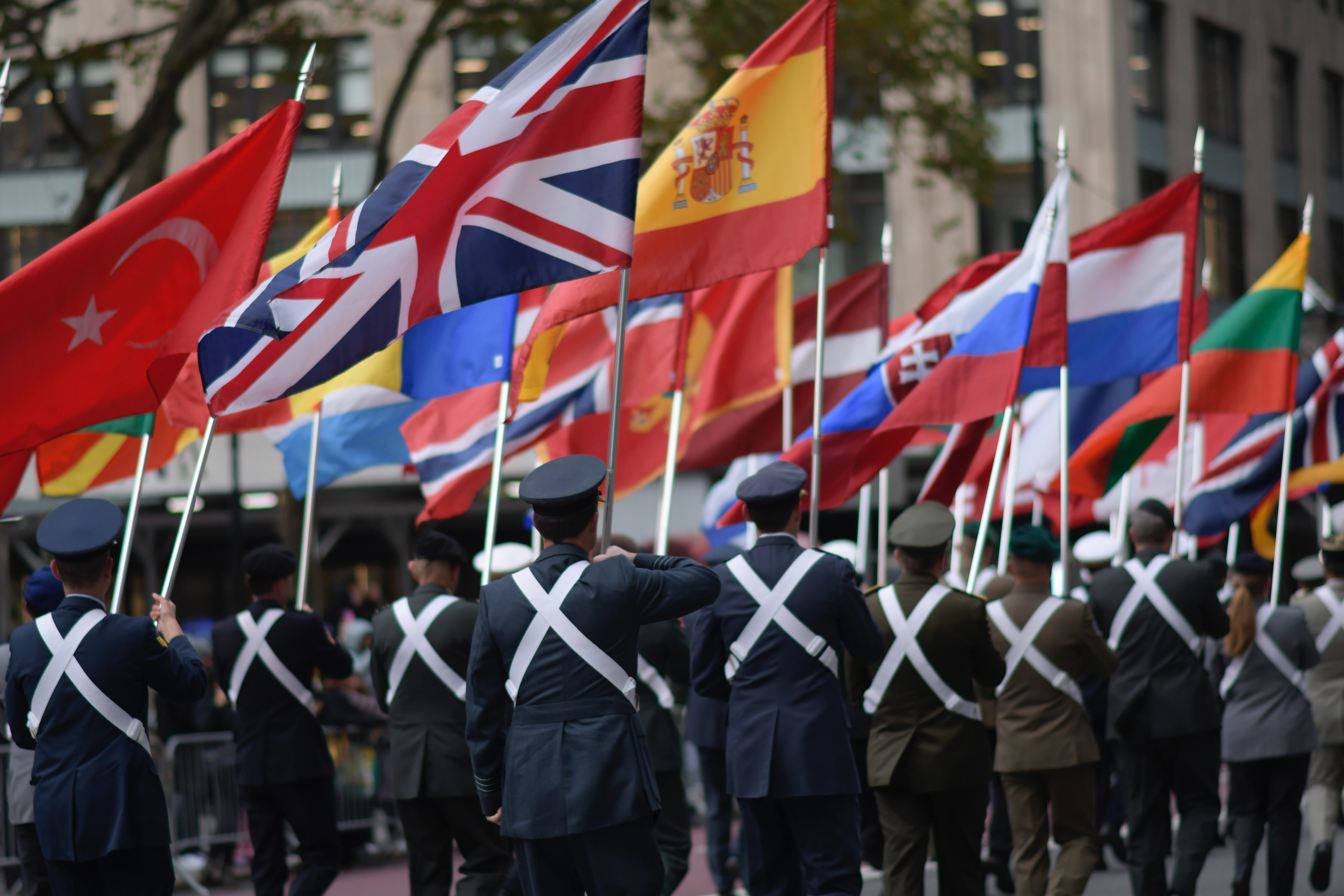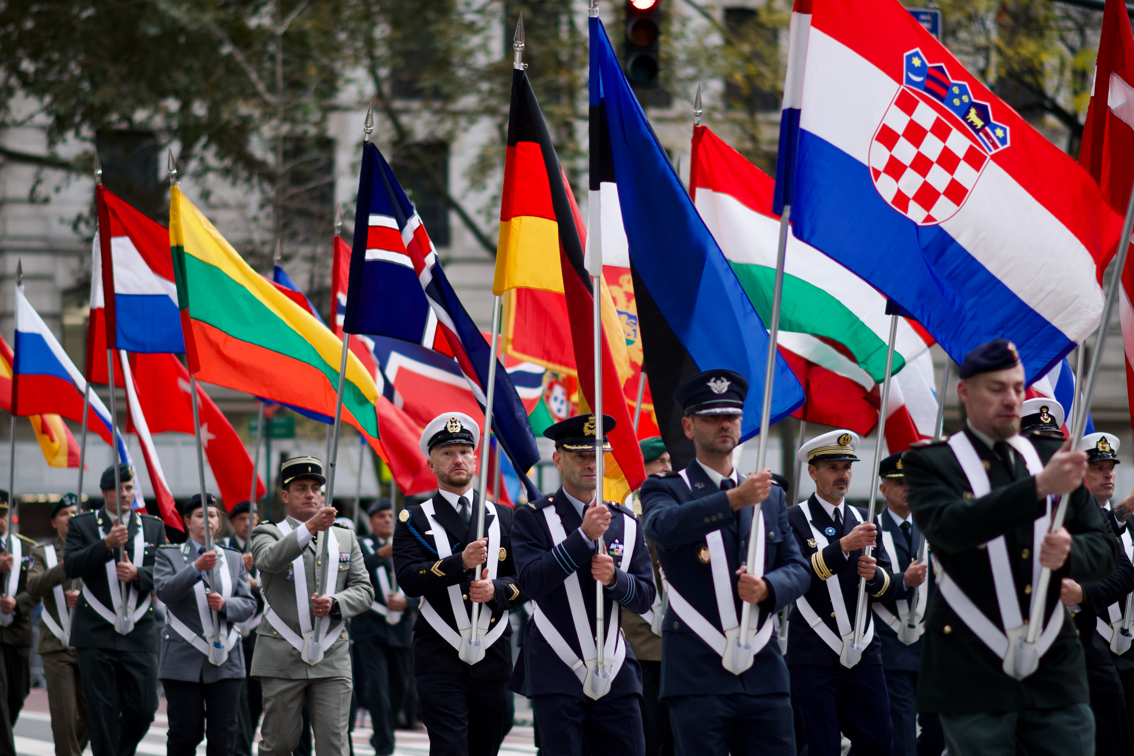 International service members march with their national flags during the Veterans Day Parade in New York on Tuesday, Nov. 11, 2025.