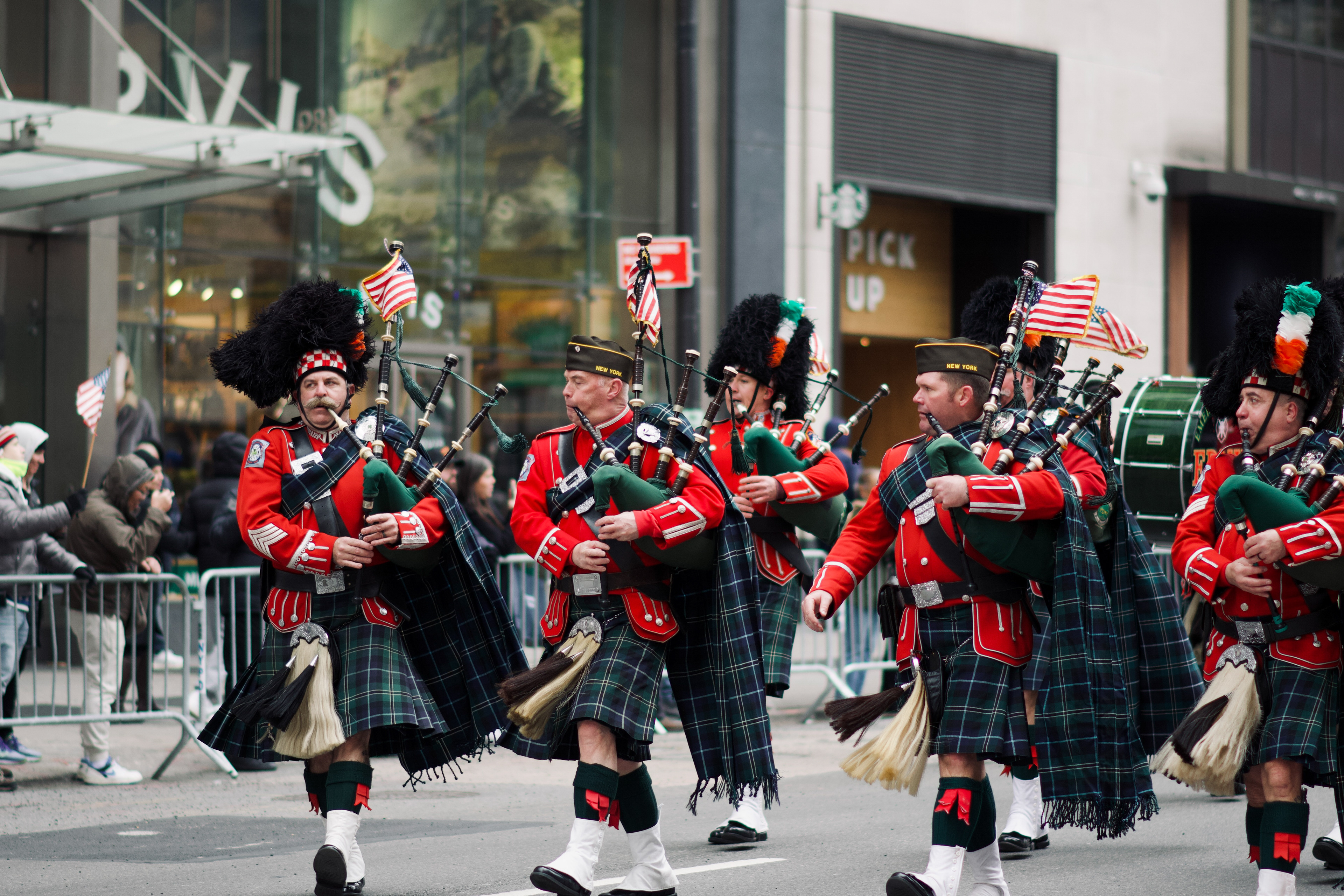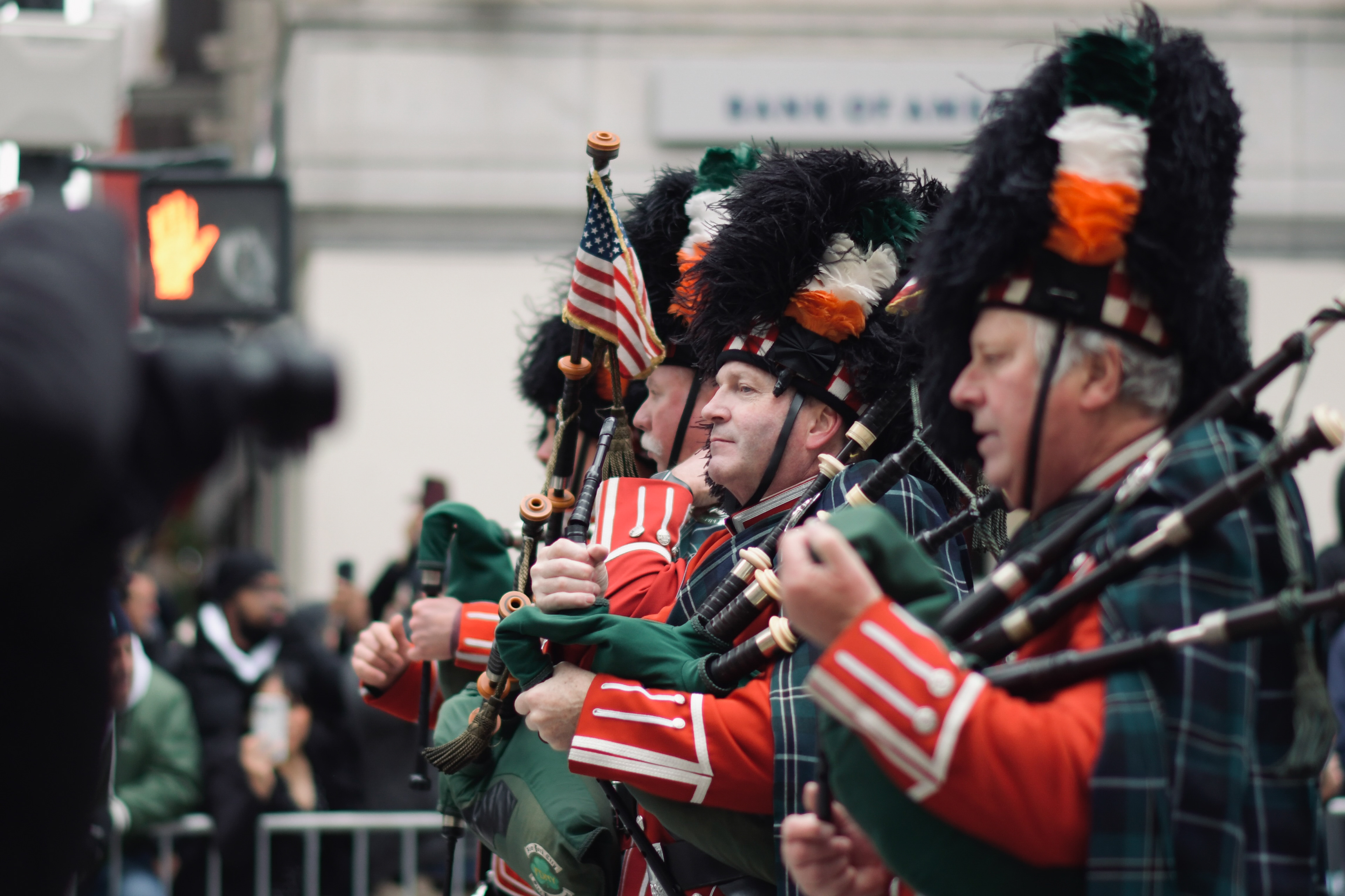 Bagpipers in red uniforms march down Fifth Avenue during the Veterans Day Parade in New York on Tuesday, Nov. 11, 2025. ©Chengchao Li 2025