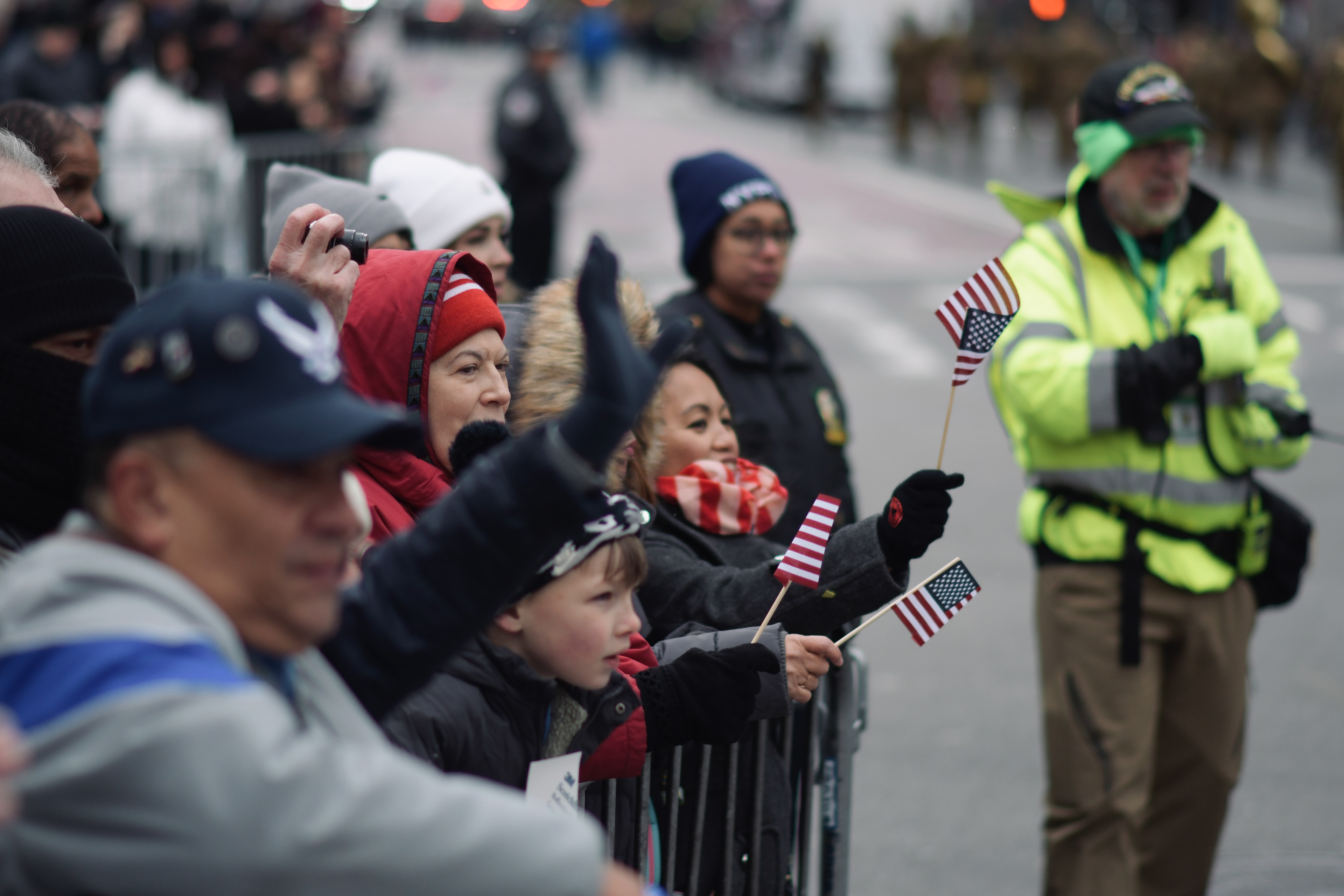 Spectators wave small American flags as the Veterans Day Parade passes through Manhattan on Tuesday, Nov. 11, 2025. ©Chengchao Li 2025