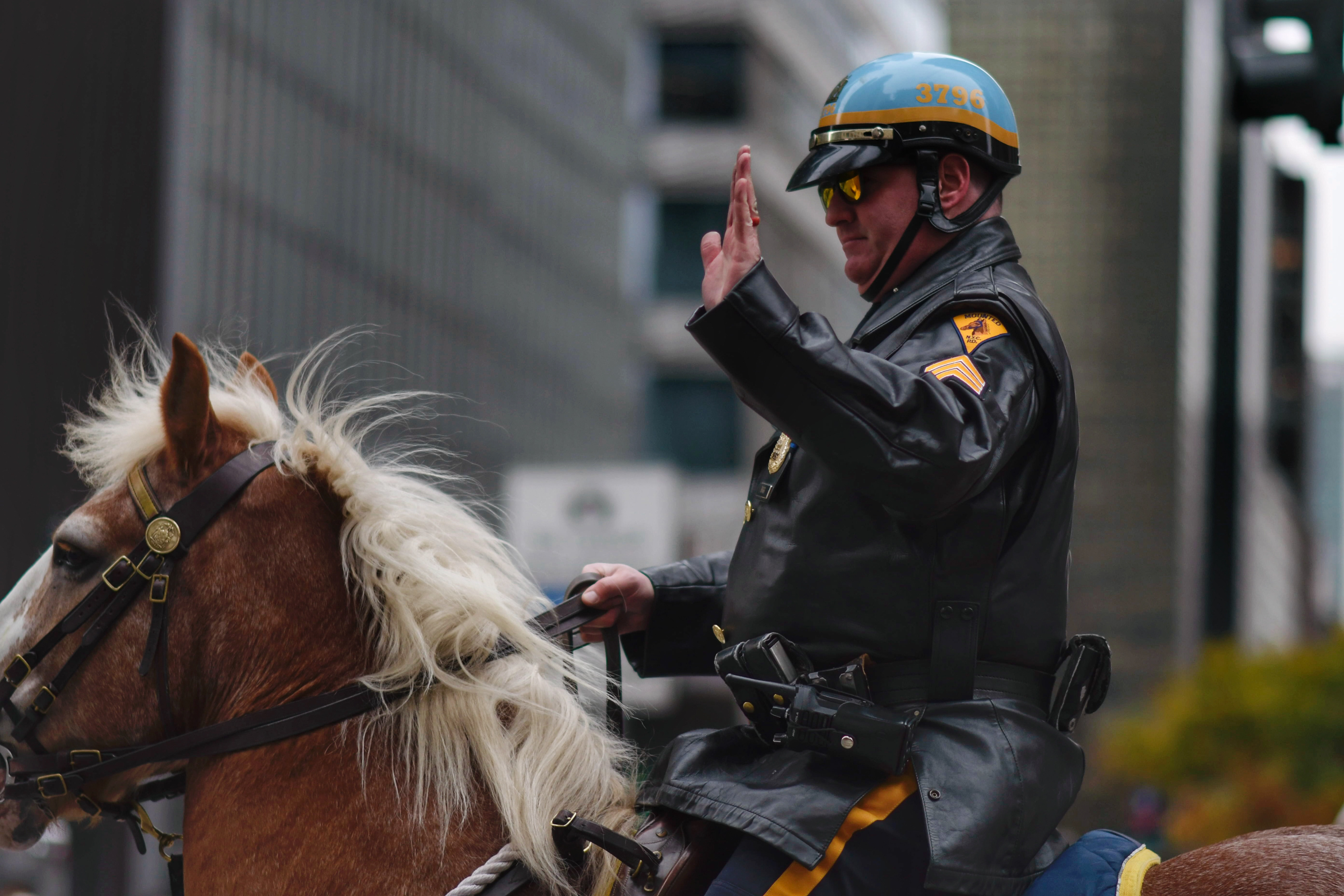 A police officer on horseback waves to the crowd during the Veterans Day Parade in New York on Tuesday, Nov. 11, 2025. ©Chengchao Li 2025