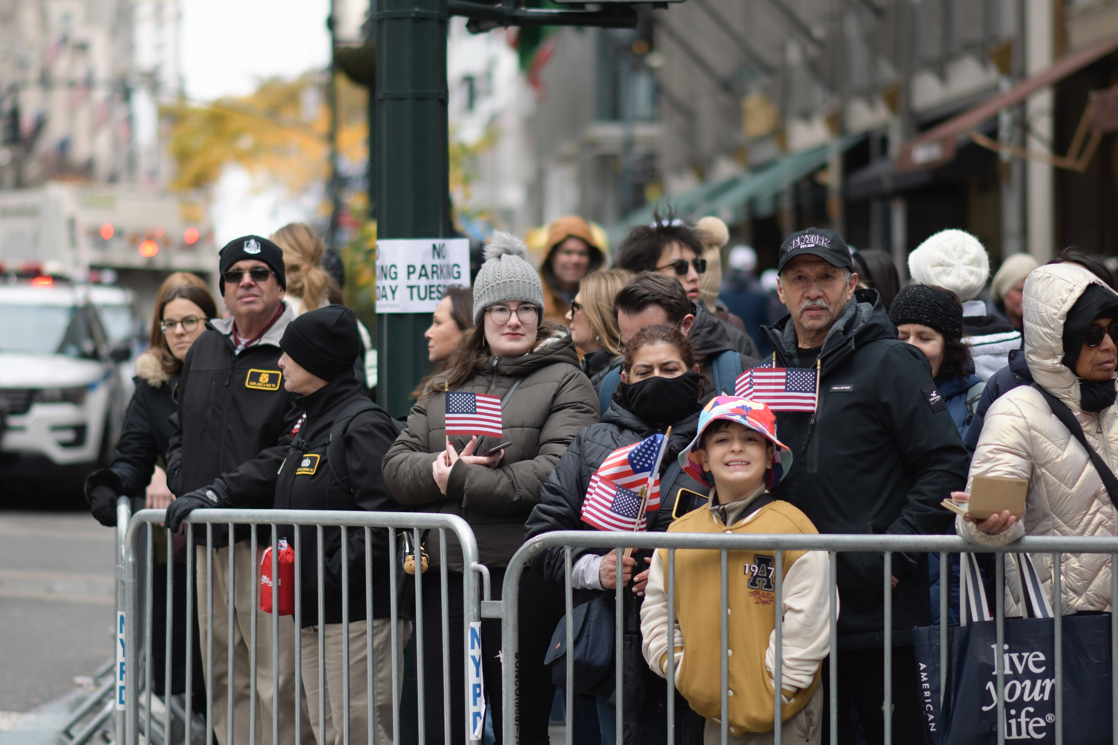 Spectators line the barricades holding American flags during the Veterans Day Parade in New York on Tuesday, Nov. 11, 2025.