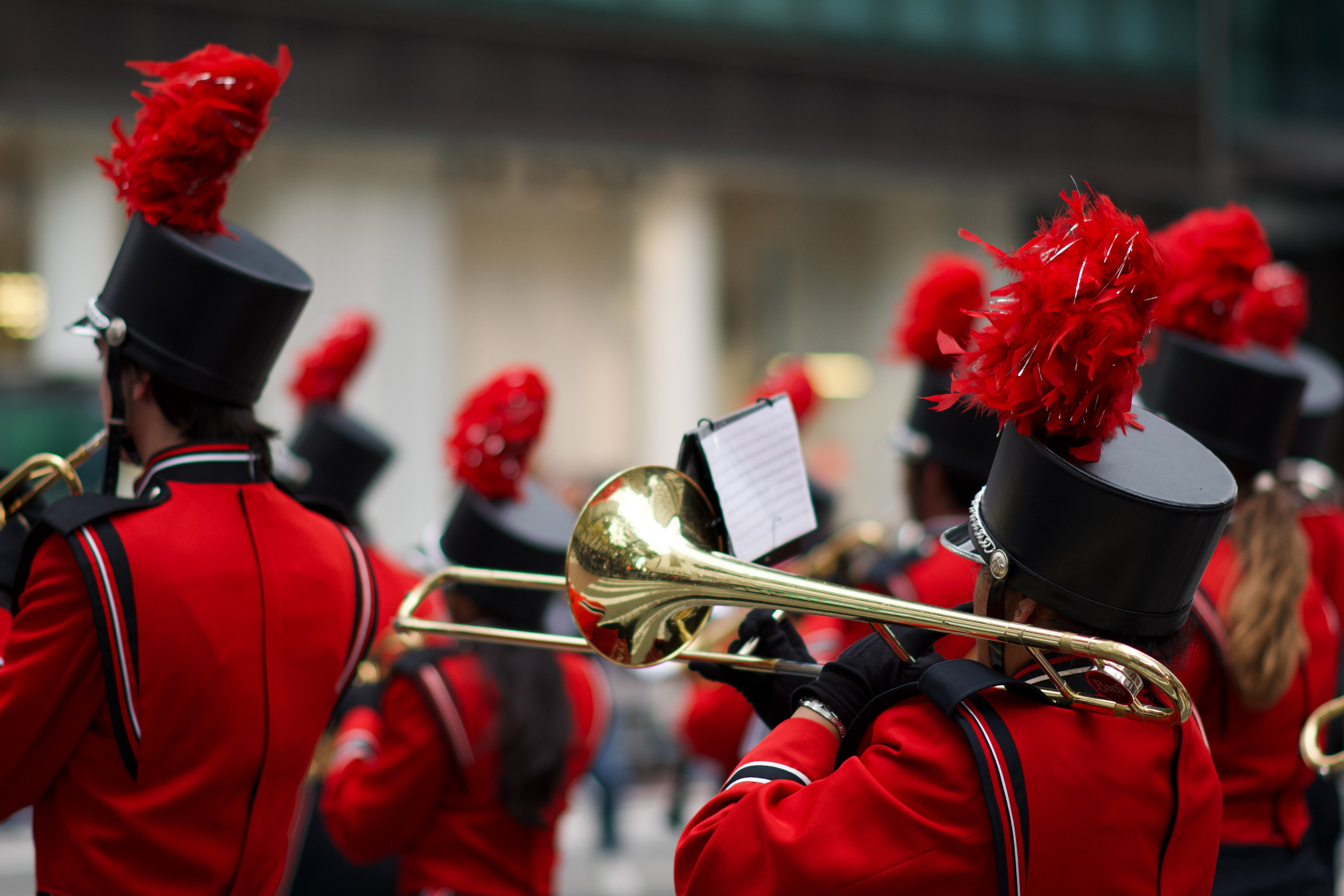 A marching band performs in red uniforms during the Veterans Day Parade in New York on Tuesday, Nov. 11, 2025. ©Chengchao Li 2025