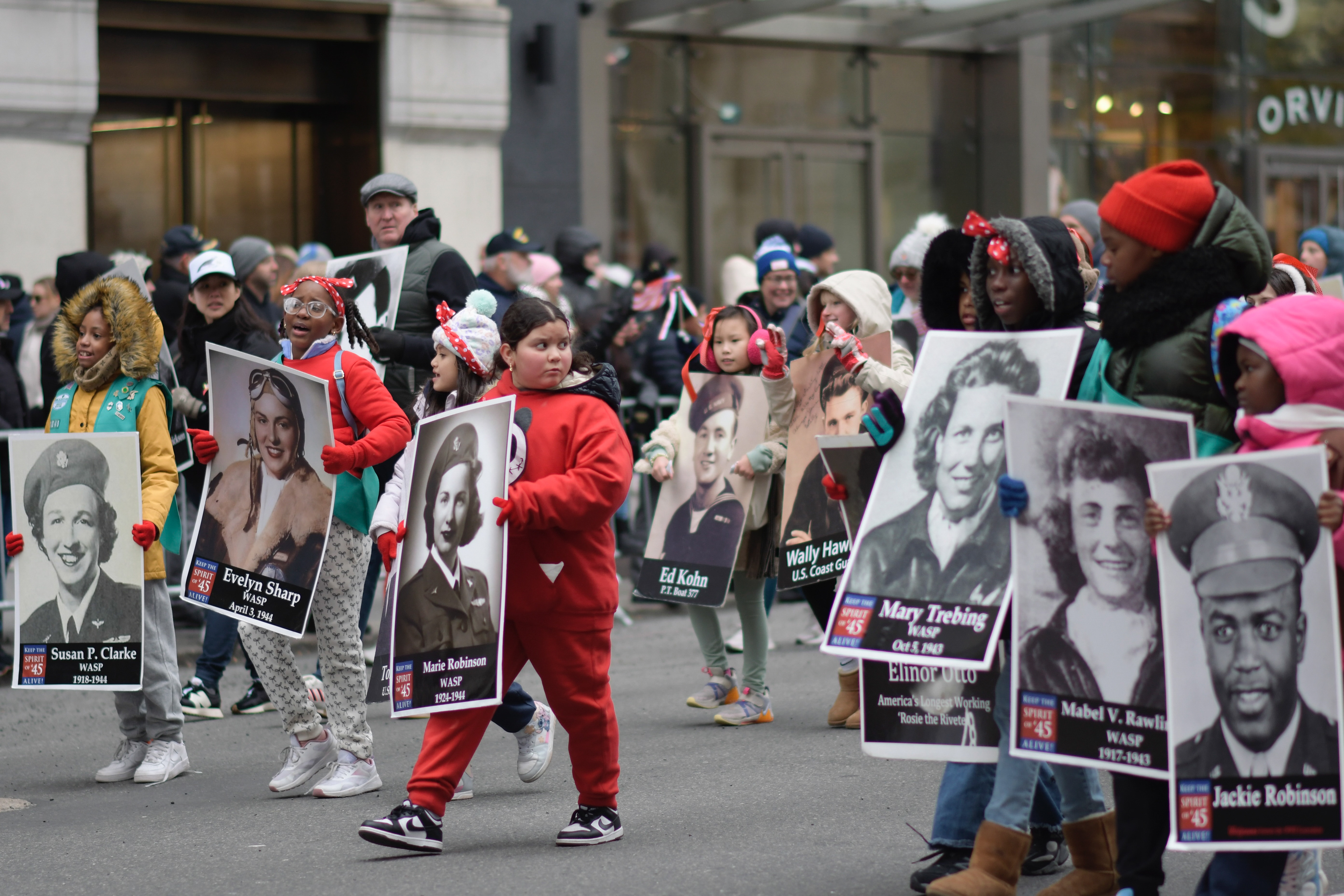 Children carry portraits of World War II veterans while marching in the Veterans Day Parade in New York on Tuesday, Nov. 11, 2025. ©Chengchao Li 2025