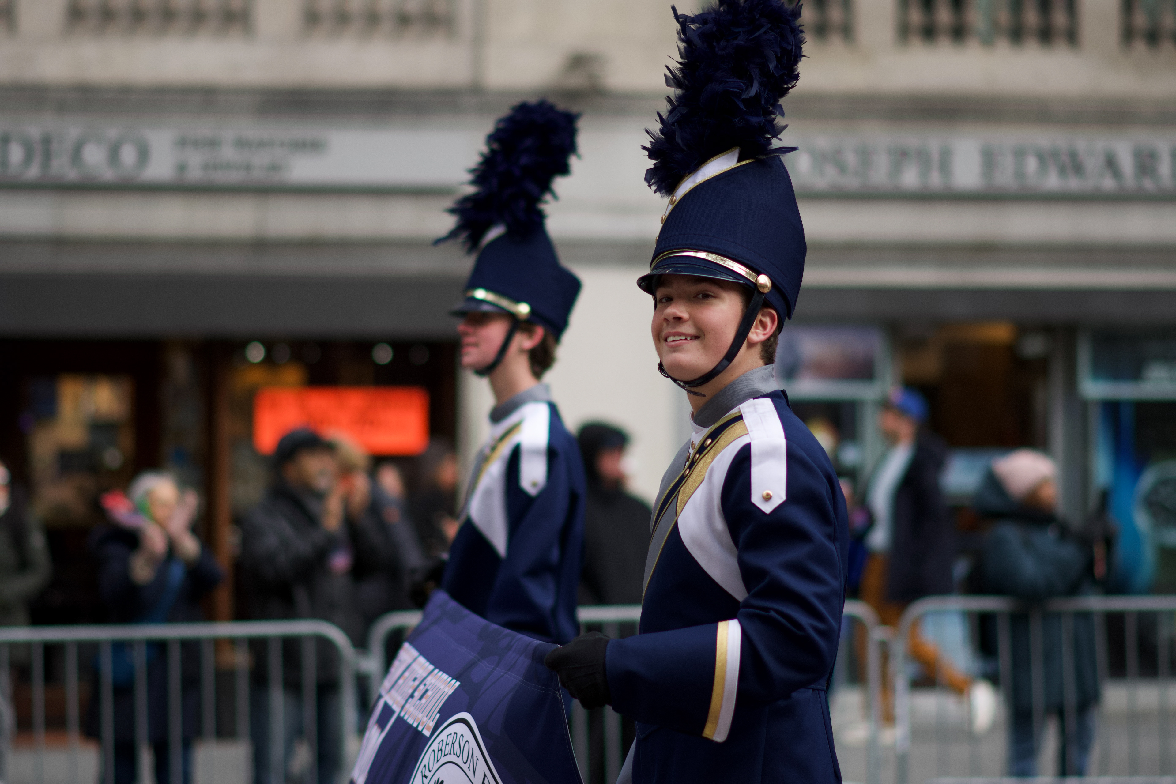Marching band members smile while carrying their banner during the Veterans Day Parade in New York on Tuesday, Nov. 11, 2025.