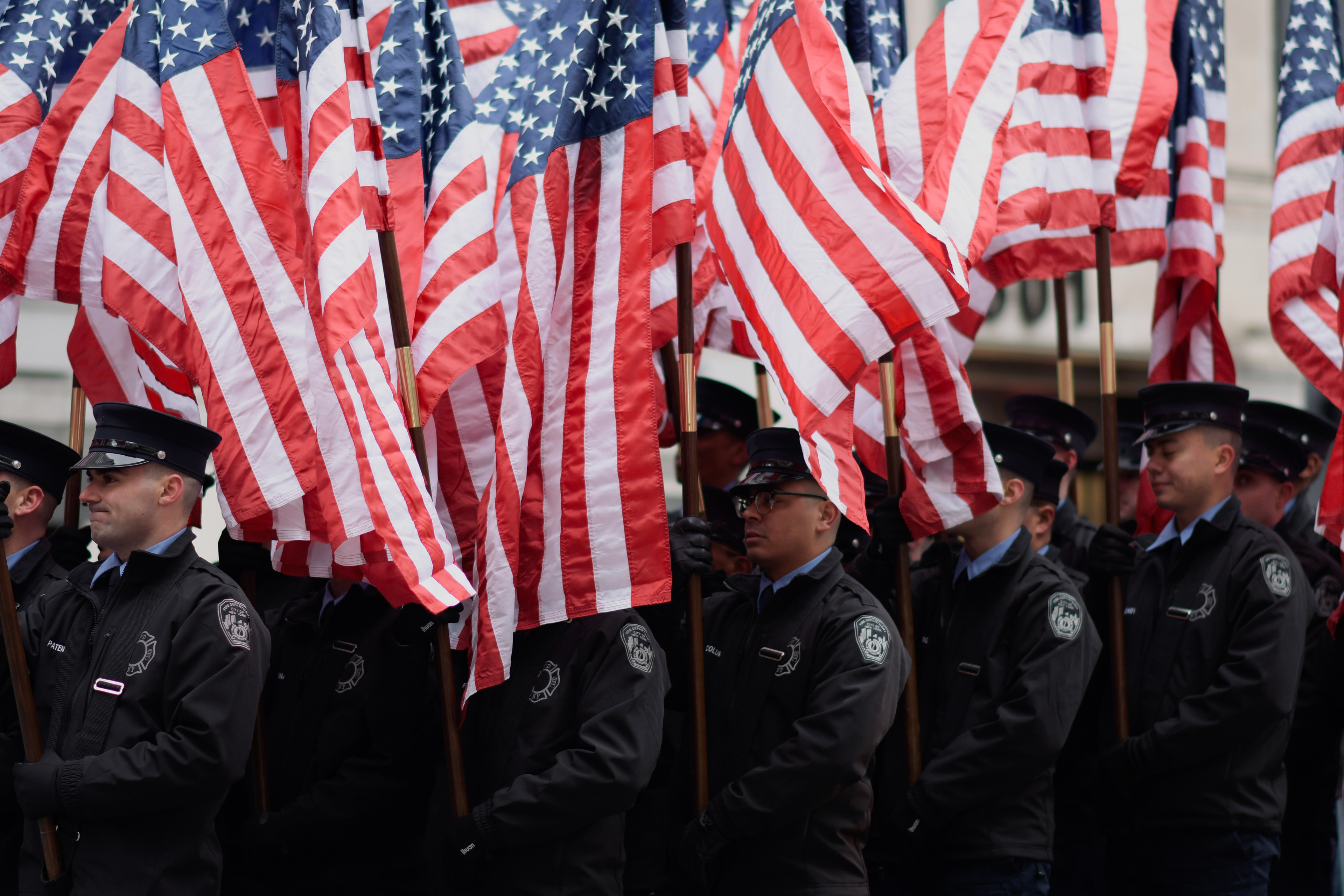 Firefighters carry American flags while marching in the Veterans Day Parade in New York on Tuesday, Nov. 11, 2025. ©Chengchao Li 2025