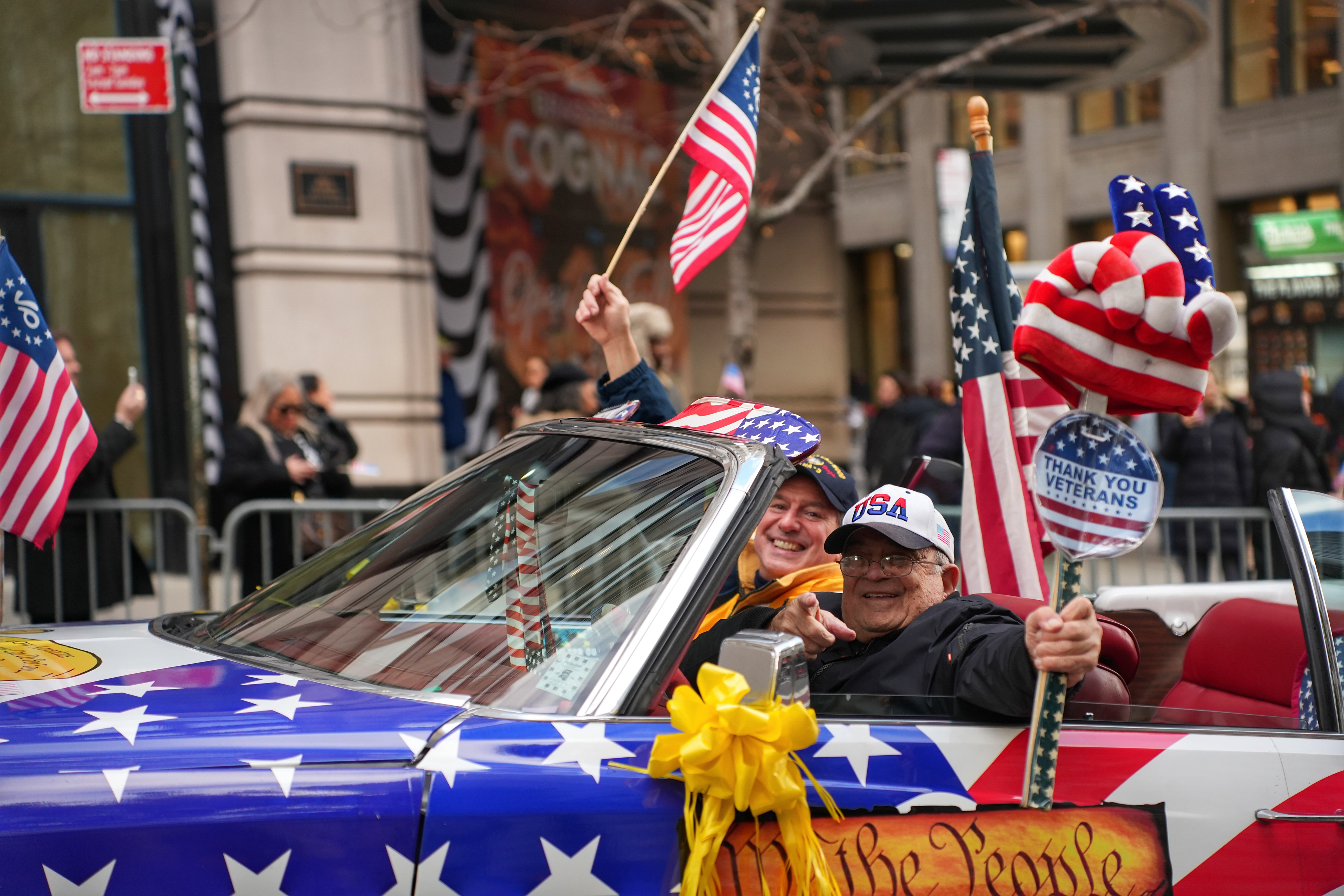 Participants riding in a patriotic convertible wave American flags during the Veterans Day Parade in New York on Tuesday, Nov. 11, 2025.