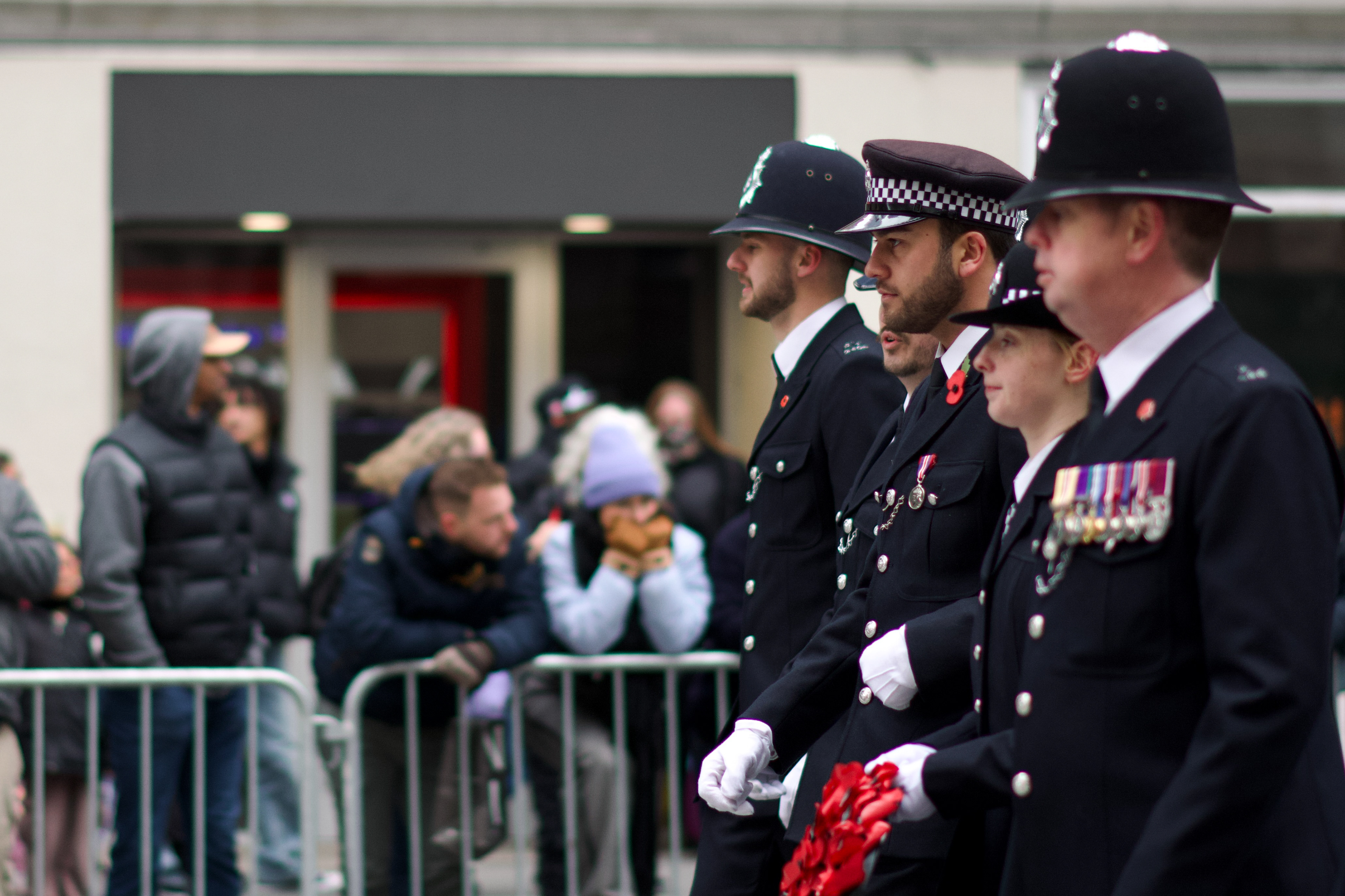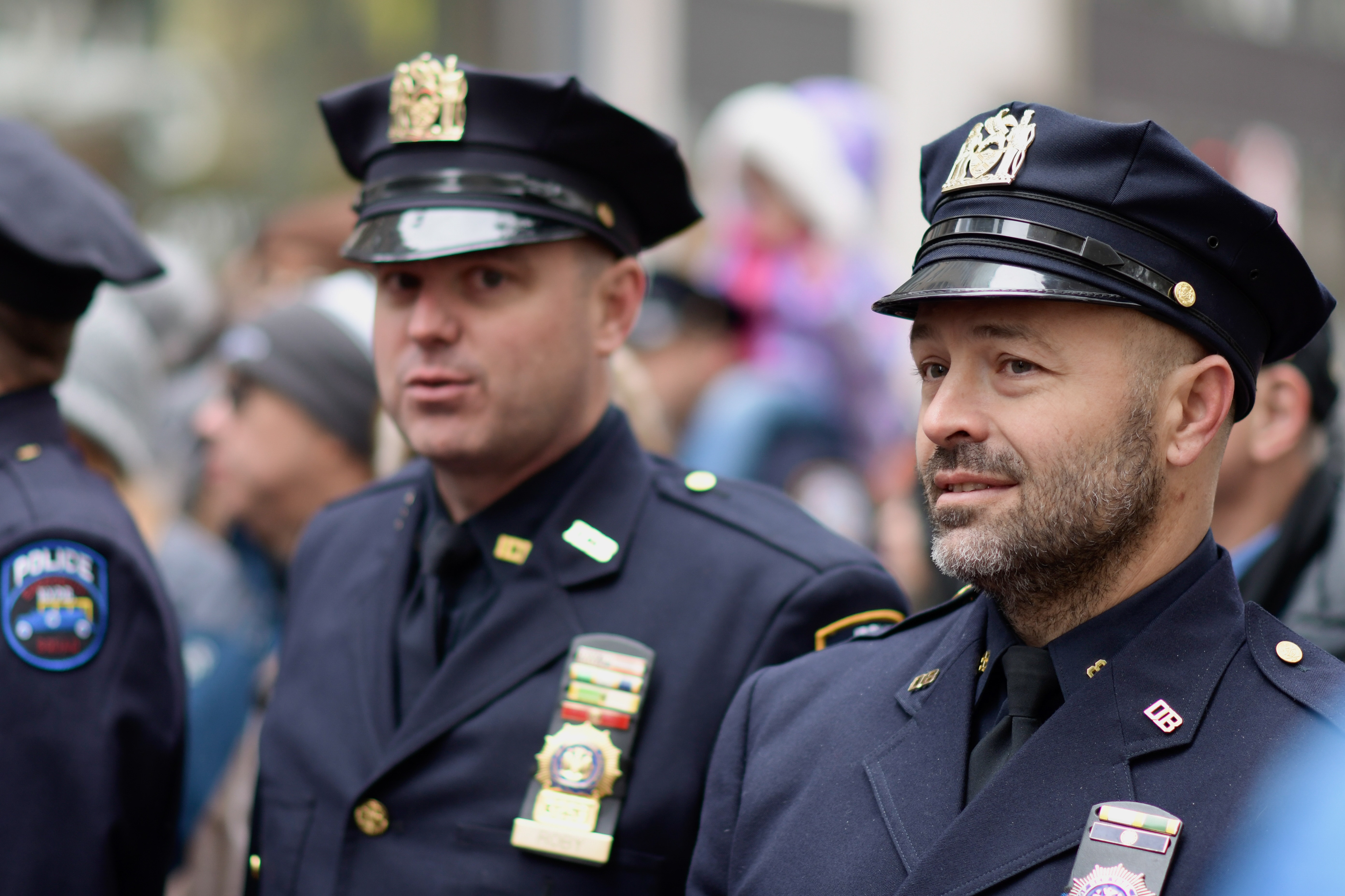 Police officers stand together as crowds gather for the Veterans Day Parade in New York on Tuesday, Nov. 11, 2025. ©Chengchao Li 2025