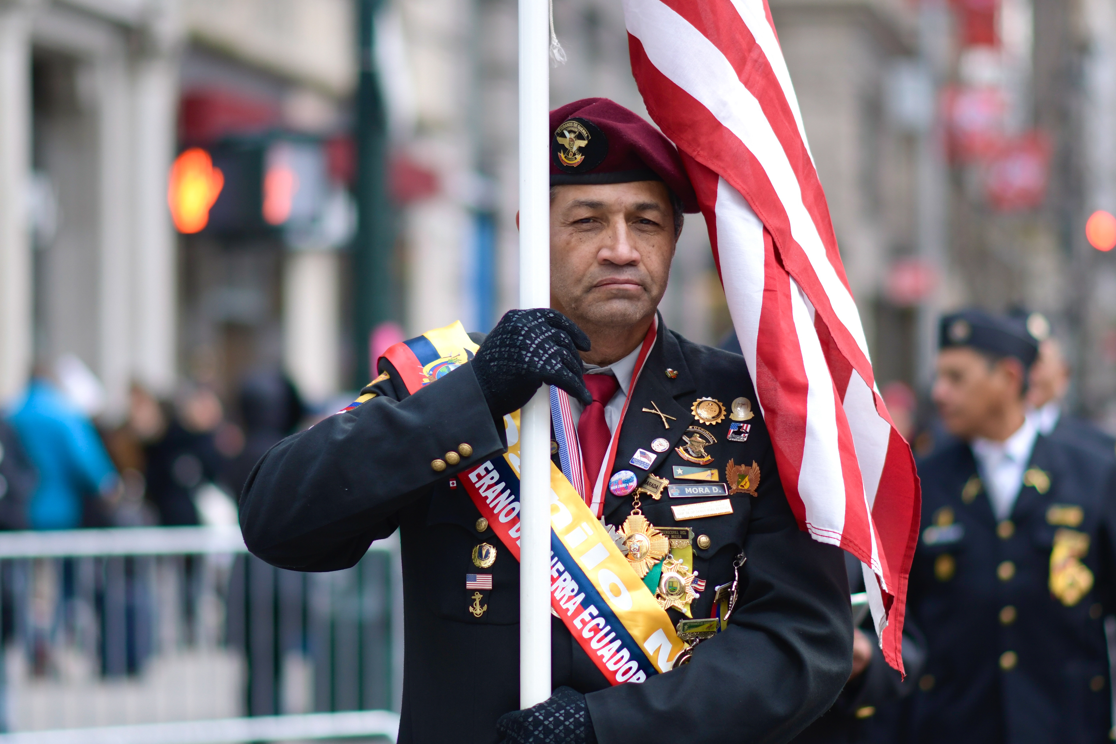 A decorated veteran carries the American flag while marching in the Veterans Day Parade in New York on Tuesday, Nov. 11, 2025.