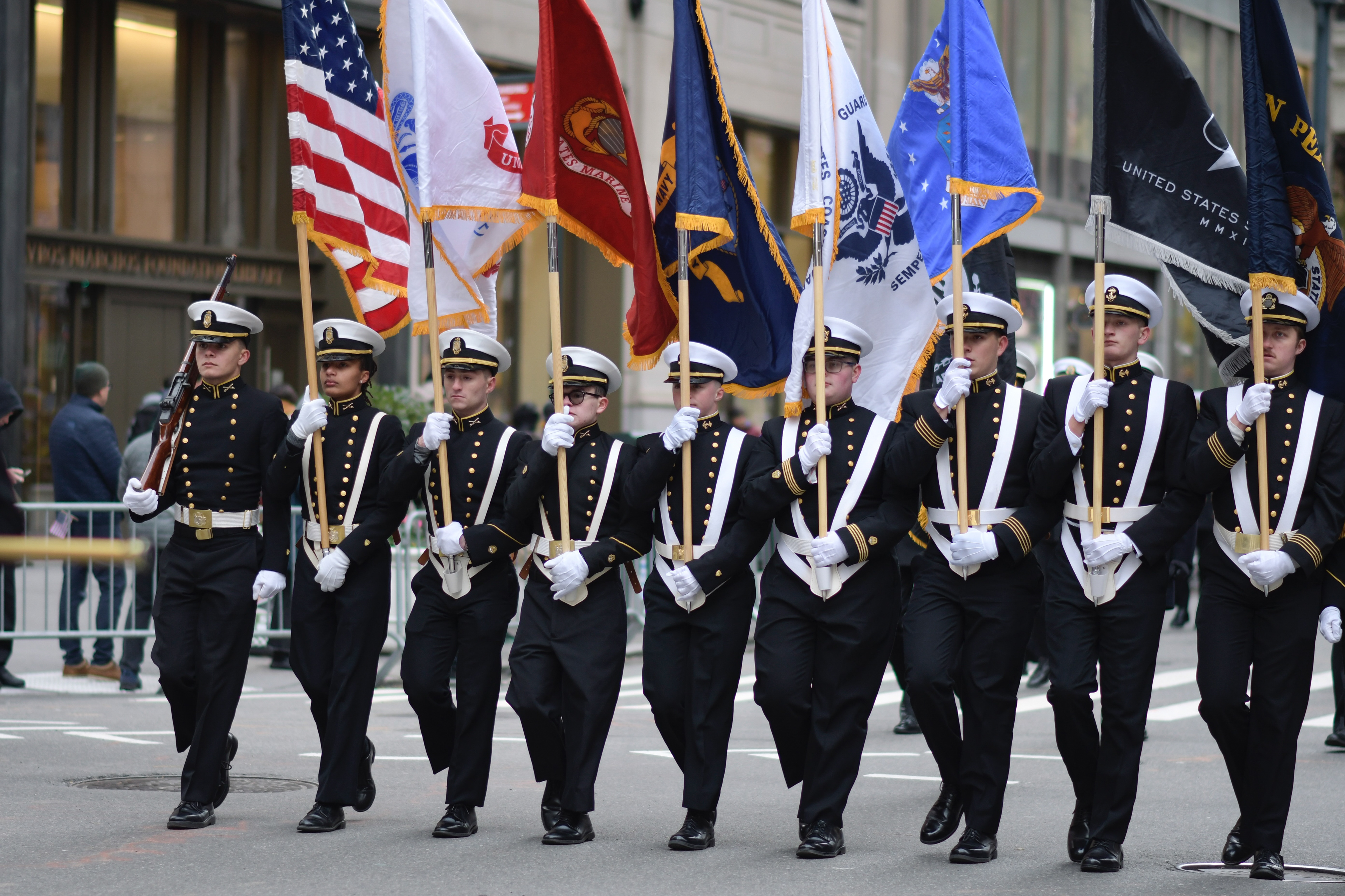 A military color guard marches with U.S. service flags during the Veterans Day Parade in New York on Tuesday, Nov. 11, 2025.
