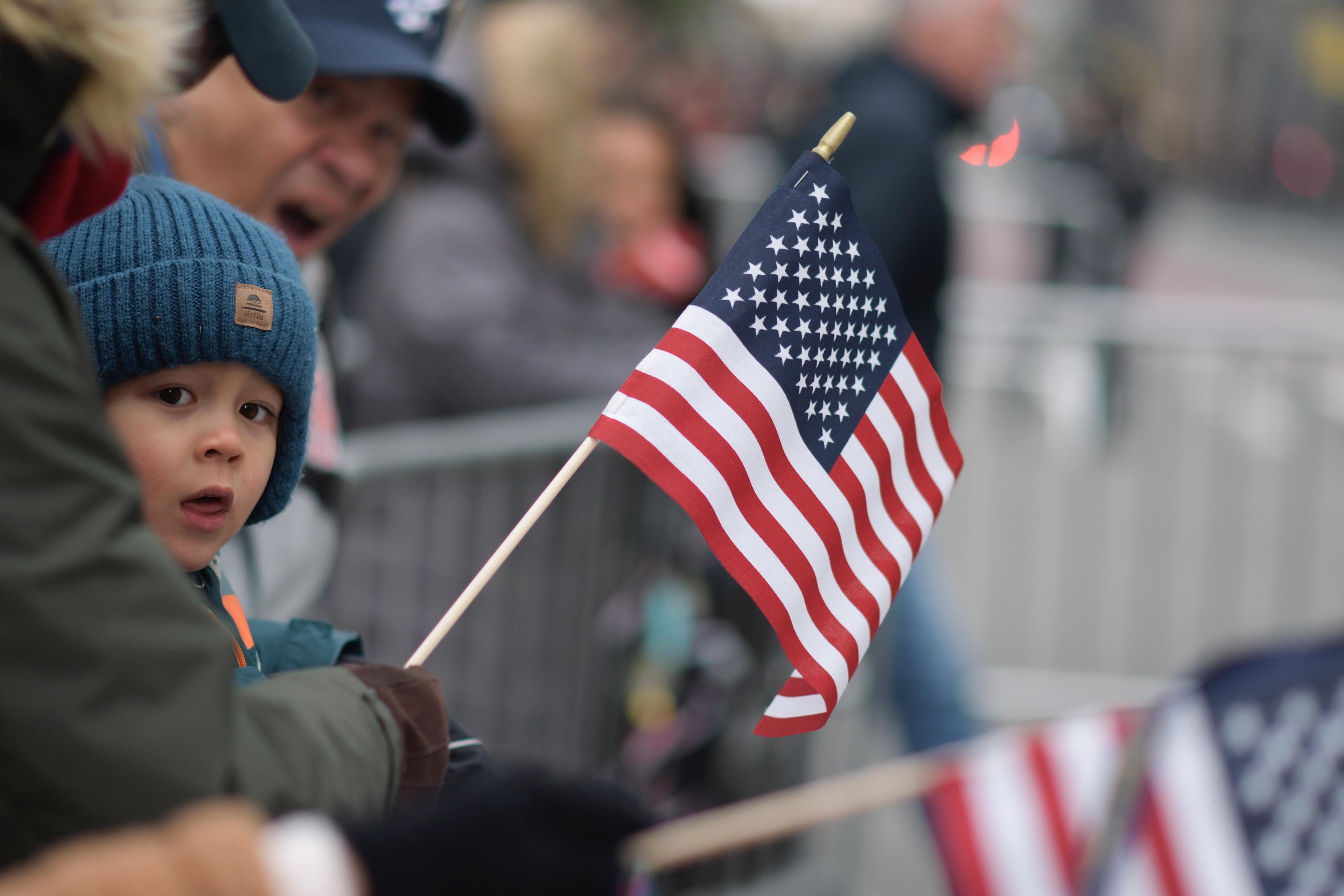 A young child watches the Veterans Day Parade while holding an American flag in New York on Tuesday, Nov. 11, 2025.