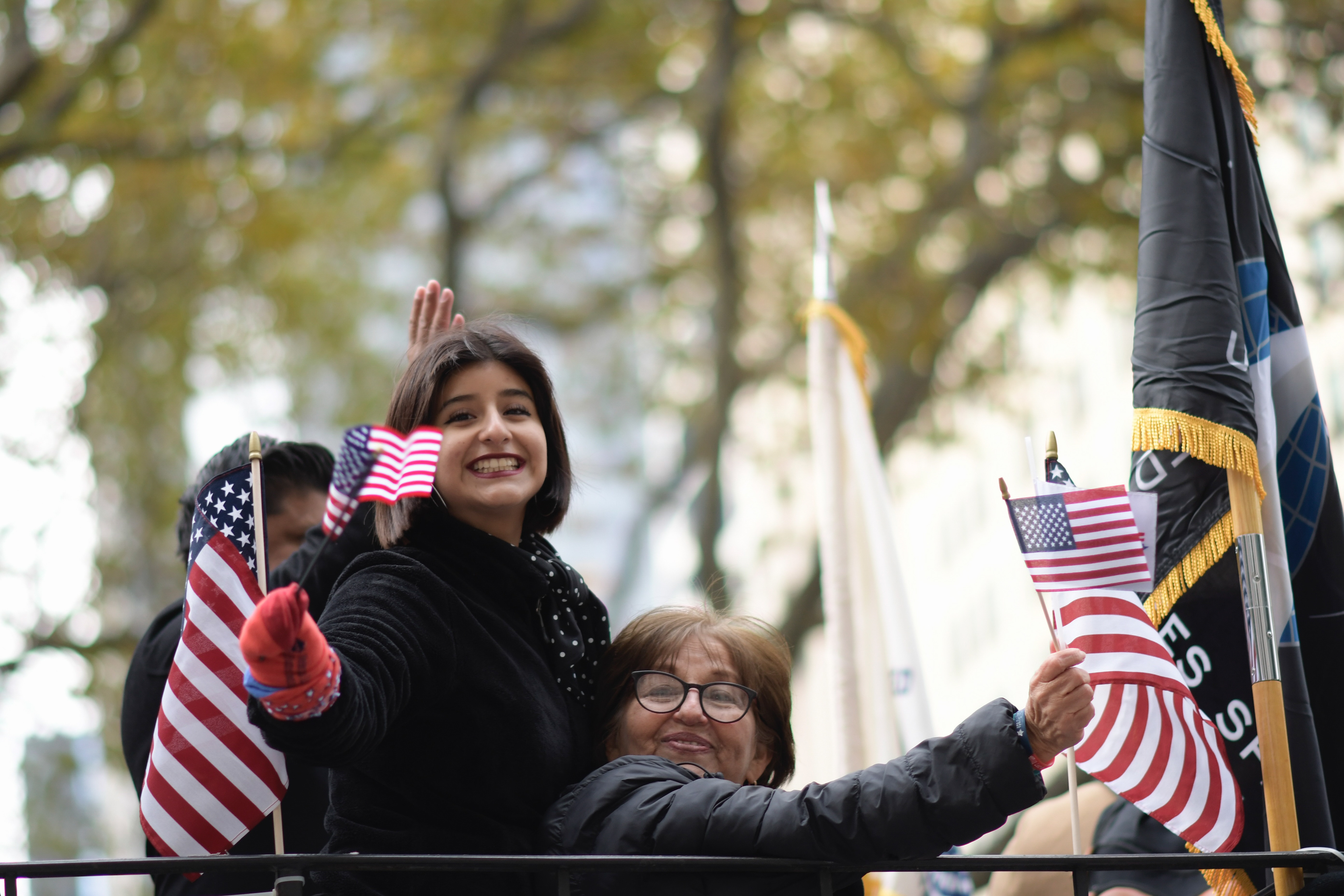 Women wave American flags from a parade float during the Veterans Day Parade in New York on Tuesday, Nov. 11, 2025.